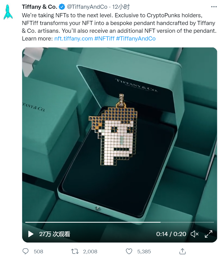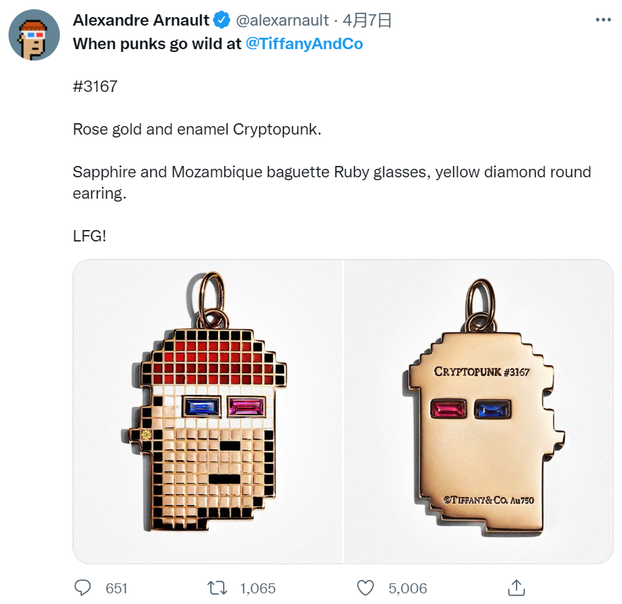 事实上,NFTiff并非蒂芙尼在NFT领域的首次尝试,早在今年3月,这家珠宝公司就以115 ETH(38万美元)的价格购买了NFT系列Rocket Factory的Okapi NFT,并将其设置为推特头像。4月7日,蒂芙尼副总裁Alexandre Arnault就在推特上分享了其个人持有的CryptoPunk #3167的珠宝饰品,由玫瑰金和珐琅打造,搭配莫桑比克红宝石和蓝宝石眼镜以及黄色钻石耳钉。
