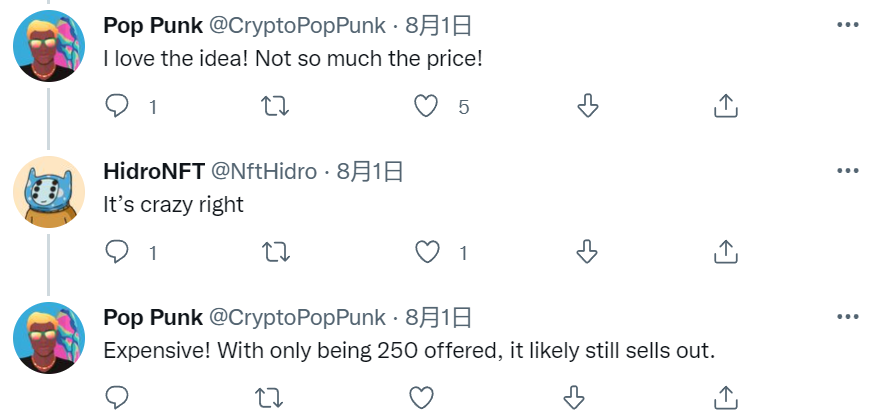 然而,推特用户@LeoAlhalabi表示对该NFT的价格并不感到震惊,并且认为人们会出于心理原因而购买:“如果有奢侈品牌进入NFT市场,将是相当昂贵的,它只会吸引那些并不真正在意在NFT项目上花这么多钱的有钱人。你必须明白,人们在蒂芙尼买一个10000美元的手链,上面可能有价值800美元的黄金,他们会支付10倍的溢价,而只是为了从蒂芙尼买到东西。”而另一位用户@TheFitBeaute则充满信心:"本来希望看到蒂芙尼和CryptoPunks合作的免费NFT和珠宝。毫无疑问,这将是一个售罄的版本,很多人消费得起30 ETH。"