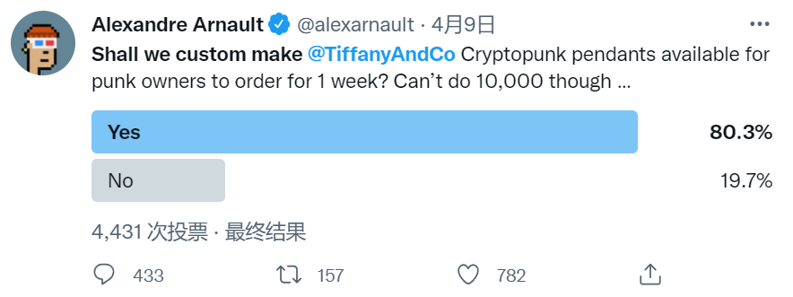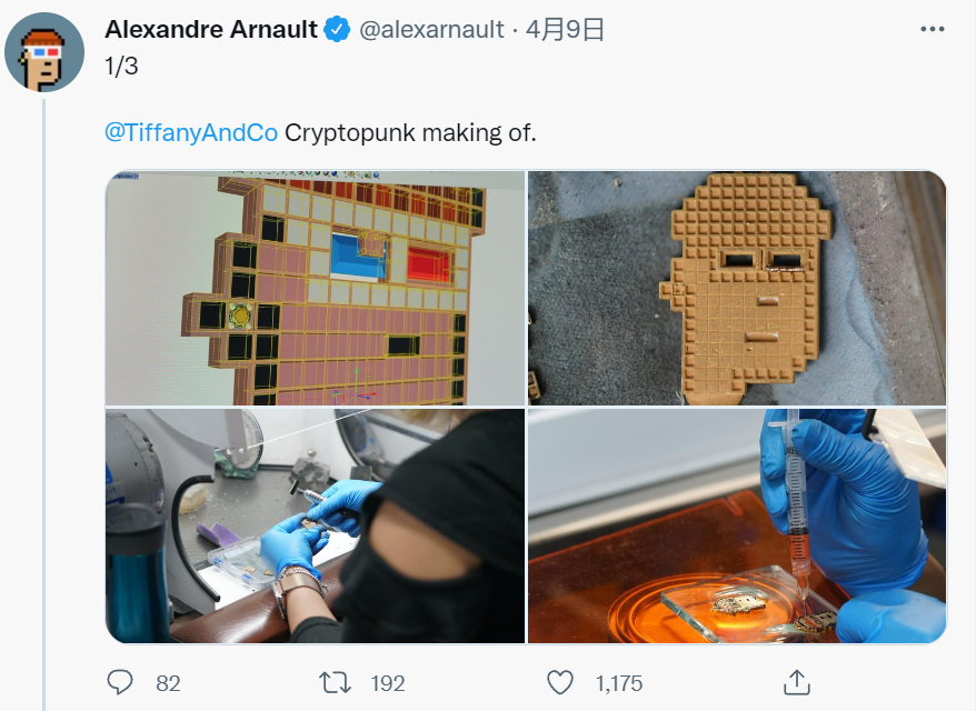 4月9日,Alexandre Arnault分享了其NFT吊坠制作过程的图片,并在推特上就是否要向CryptoPunk持有者提供蒂芙尼和CryptoPunks的联名吊坠发起投票,80%的用户表示赞同。