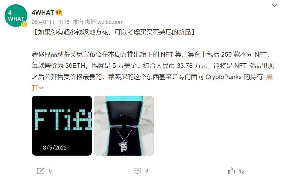 8月1日,美国奢侈珠宝品牌蒂芙尼(Tiffany & Co)在推特上宣布,其将面向CryptoPunks NFT持有者推出名为NFTiff的NFT系列,限量250个。CryptoPunk持有者可将其持有的NFT转变为由蒂芙尼工匠手工制作的定制吊坠,还将收到该吊坠的NFT版本。NFTiff将于美国东部时间8月5日10:00开始销售,价格为30 ETH,该NFT不会进行空投,每位客户最多可购买3个NFTiff。