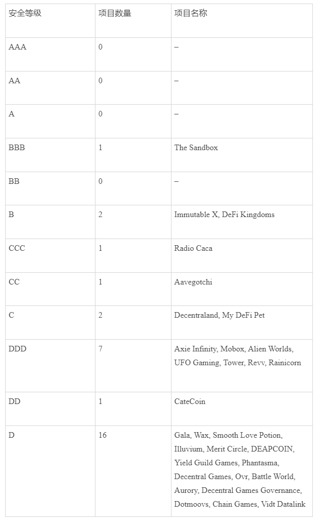 目前的网络安全分析涵盖了31个项目,结果不理想。虽然只有Axie Infinity发生过安全事故,但这些项目都没有获得AAA、AA甚至A的安全评级。(CER.live采用了经典的评级方法,AAA为最高评级,D为最低评级。低于DDD的评级意味着未来发生黑客攻击或其他安全事件的风险增加。)