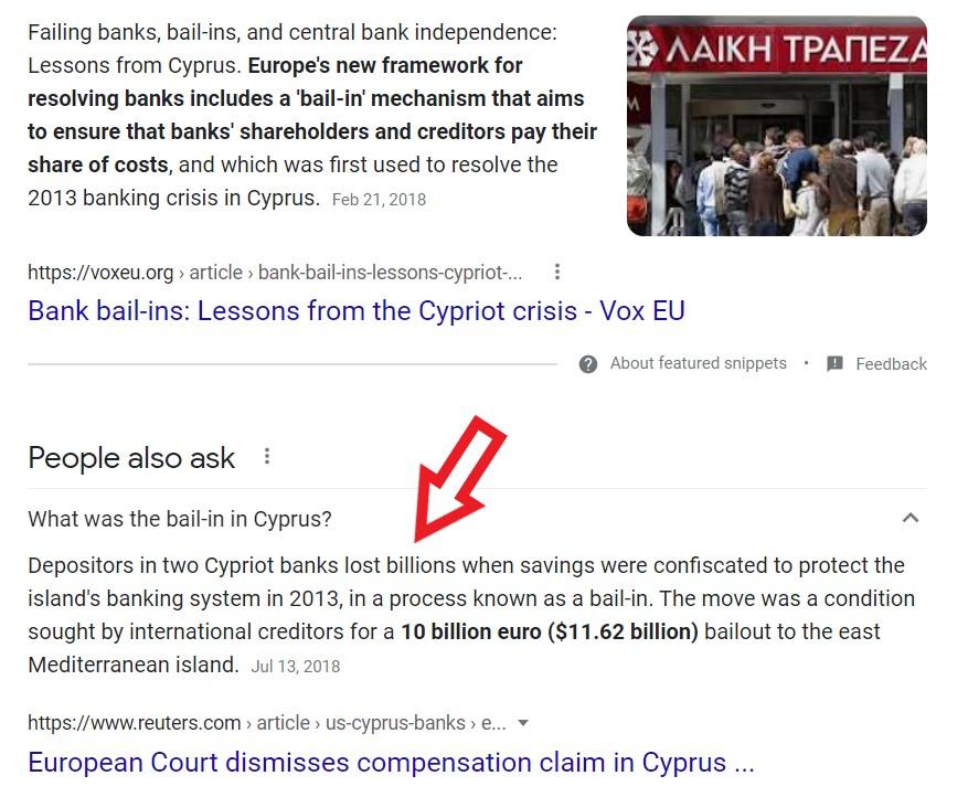 2013年,塞浦路斯两家银行的储户被没收存款,以保护该国的银行系统,这一过程被称为“纾困”(bail-in)。此举是国际债权人为向这个东地中海岛国提供100亿欧元(116.2亿美元)救助而提出的条件。