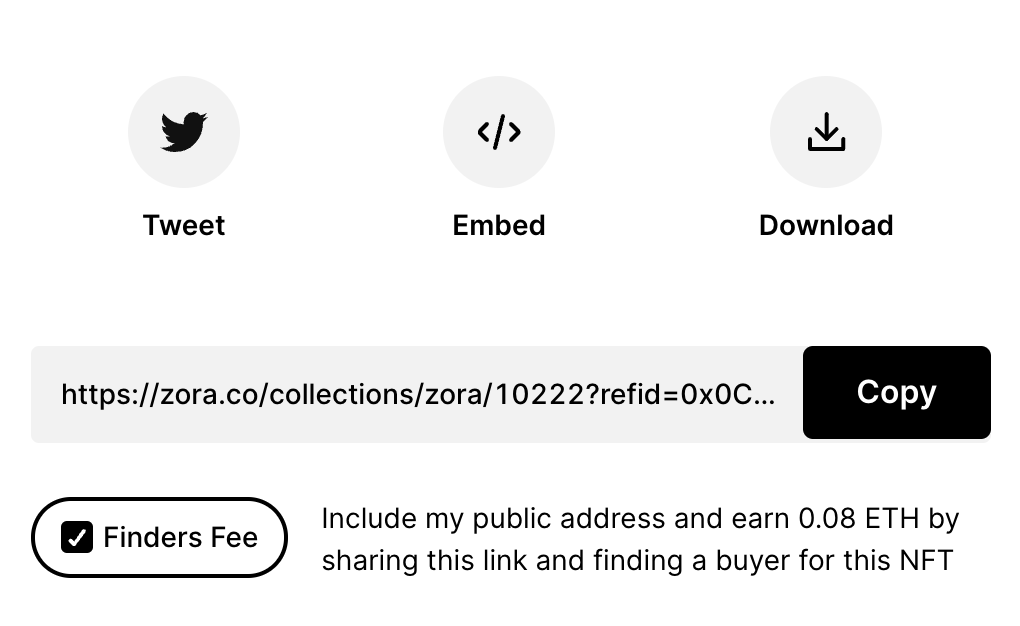 前往Zora.co, 使用钱包登录,然后开始浏览上面的NFT。如果你找到了你觉得不错的NFT,点击它,就会进入Zora的控制面板。如果这个NFT设置了Finders Fee(推荐费),点击“Copy”按钮,把链接分享给更多人——一旦有人购买此NFT,你就可以从该NFT的第一次销售中收到一定比例的佣金。