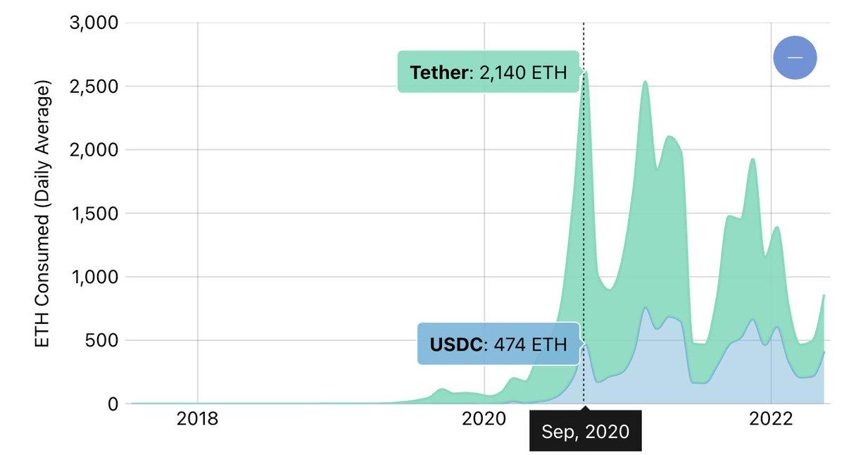 Tether支出的Gas费在DeFi Summer达到历史最高点,并在2021/2022年继续支出高额Gas费。从下图可以看出,在同一时期内,USDC的Gas费消费远低于Tether。