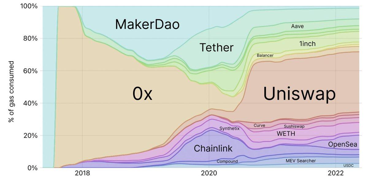解读Gas费的消费情况,可以告诉我们许许多多的故事,包括去中心化交易所的崛起,以及资本从DeFi转到NFT的历程。