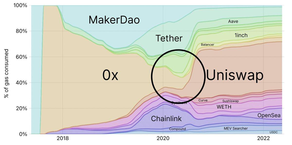 Uniswap在2020年逐步崛起,从第一代去中心化交易所和预言机手中抢夺了大量市场份额。