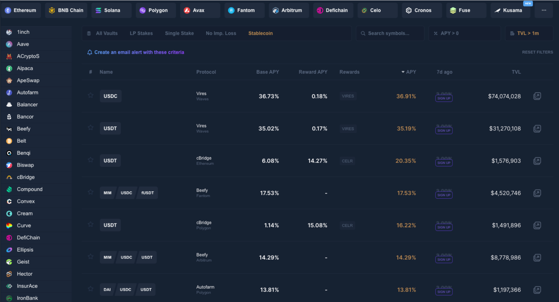 请看下面的例子,按APY排序,TVL大于100万美元的金库中的稳定币收益机会。