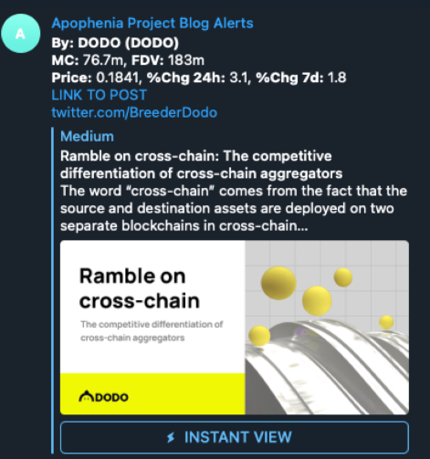另一个由InternDAO的实习生建立的机器人。这个机器人在每次项目向他们的medium/博客上传新文章时都会向你发送Telegram消息。很多项目都是先更新博客再发推文。