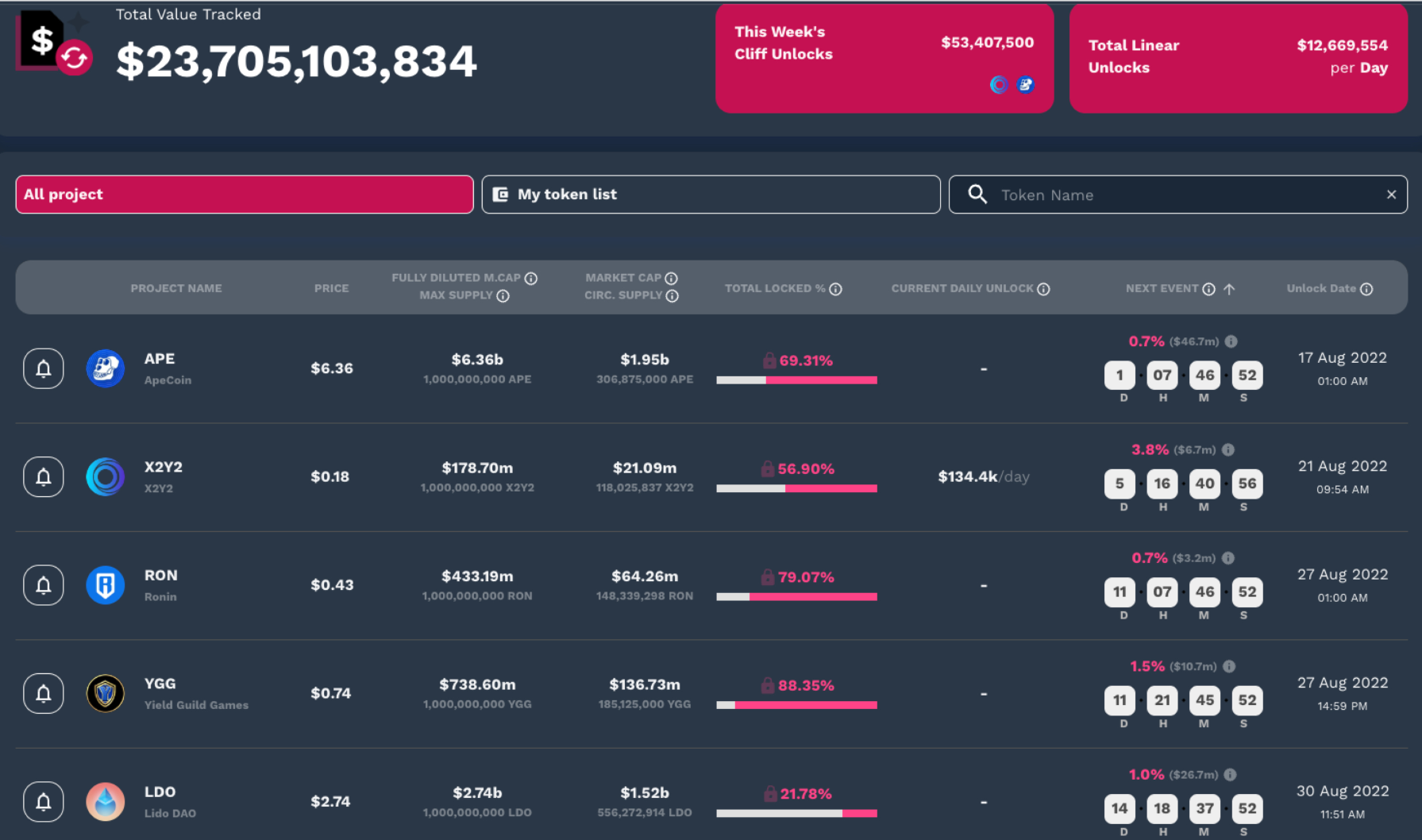 Token Unlocks是我最喜欢的跟踪代币解锁的工具。他们的界面超级直观,当你选择一个项目时,它提供了很多关于其代币经济学的细节。