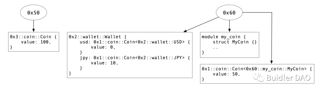 一个地址下的每种类型最多只有一个顶层值,这听起来似乎很有局限性。然而,这在实践中并不是一个问题,因为开发者可以通过定义不同的封装类型,将相同类型数据作为成员变量,从而避免了任何限制。Wallet 结构(位于图 3 中)就是一个如何使用包装器类型的例子。