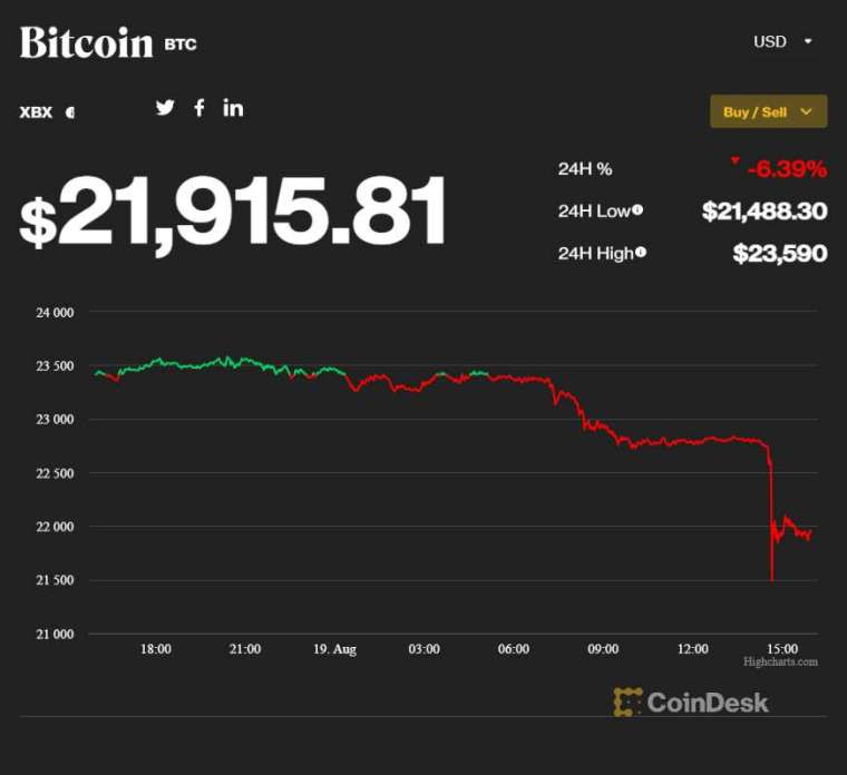 加密货币周五 (19 日) 普遍走软,比特币 (BTC) 一度跌逾 8%,失守 22000 美元关卡。