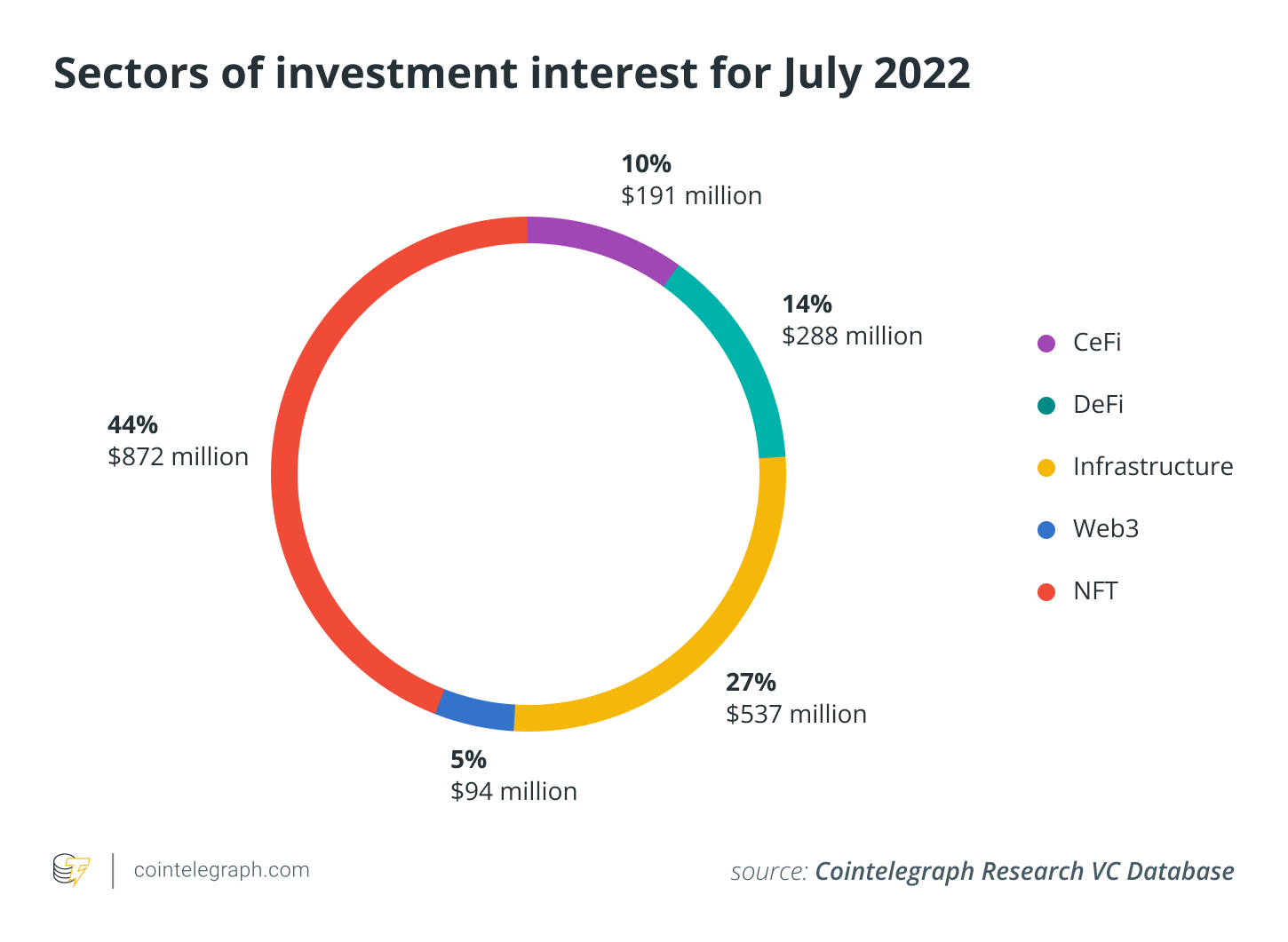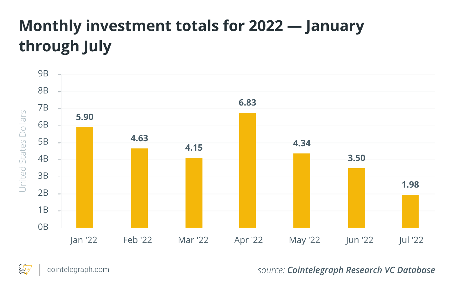通常情况下,2021年和2022年上半年区块链行业风险投资额的爆炸性增长,通常是该行业健康状况的滞后指标,在连续七个领域出现增长后,似乎正在降温。根据Cointelegraph Research的数据,2022年7月,区块链风险投资市场的资金流入额月环比下降了43%。