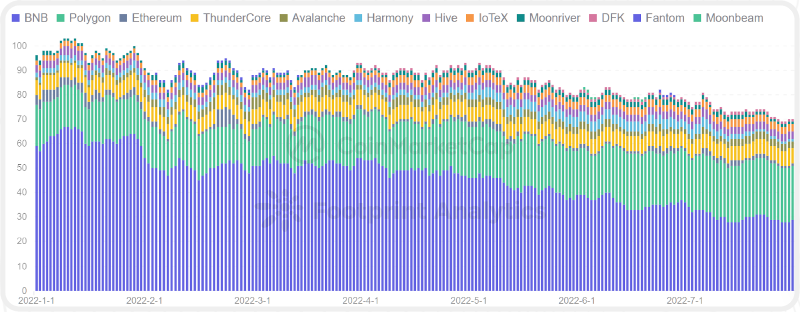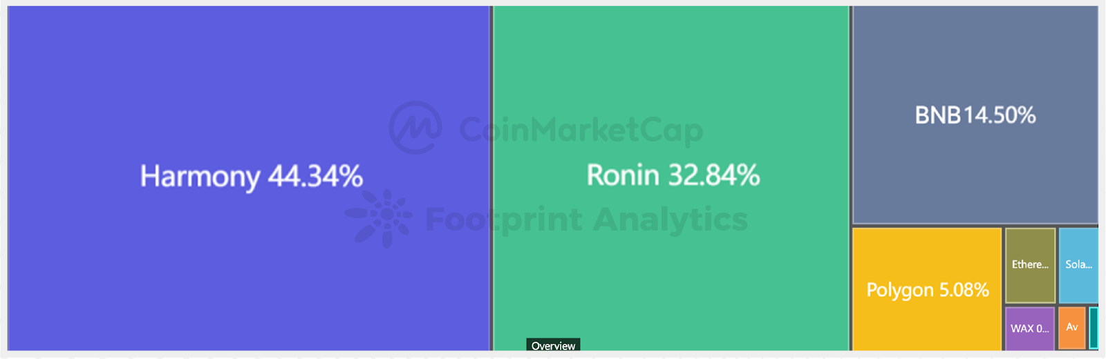 从交易量这一指标来看,Ronin 链、BNB 链(前身为 BSC 链)以及 Harmony 链的表现遥遥领先。BNB 链的交易费用低、开发难度小,吸引了众多项目在其链上建设。而 Ronin 和 Harmony 链完全依赖于其生态系统中的顶级项目来支撑——Axie Infinity 和 DeFi Kingdoms 两个项目显著提高了两个链的整体交易量。