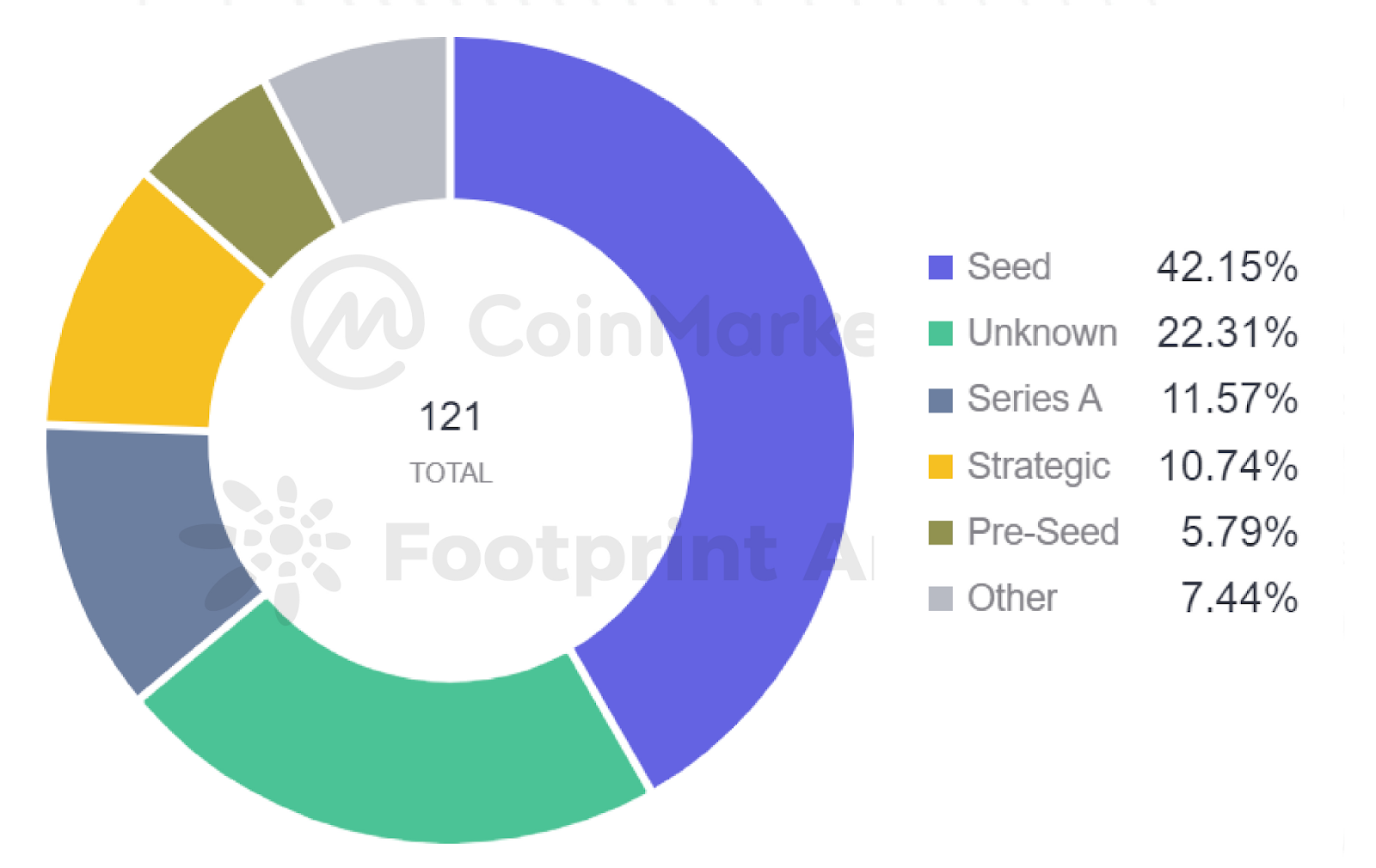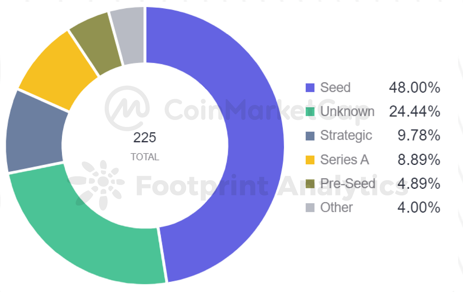 GameFi 和 Metaverse 赛道的投资轮次仍然多集中在种子轮(占总交易的48%),这说明这两个领域的市场仍然处于早期发展阶段。