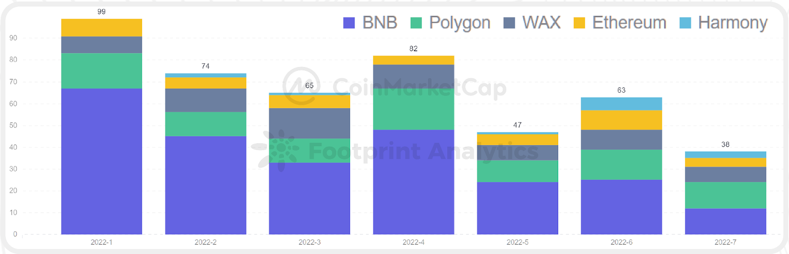 BNB 链本来是每月新增项目最多的公链,自 5 月熊市来临后,其新游戏数量明显减少。其他链的新增项目数相对稳定,其中 Polygon 链的相对增幅最大,其次是 WAX 链。虽然市面上的公链很多,但仍然可以看出,开发者们还是更多选择 Polygon 链、WAX 链和 BNB 链,因为其收费低,因此对开发者更加友好。