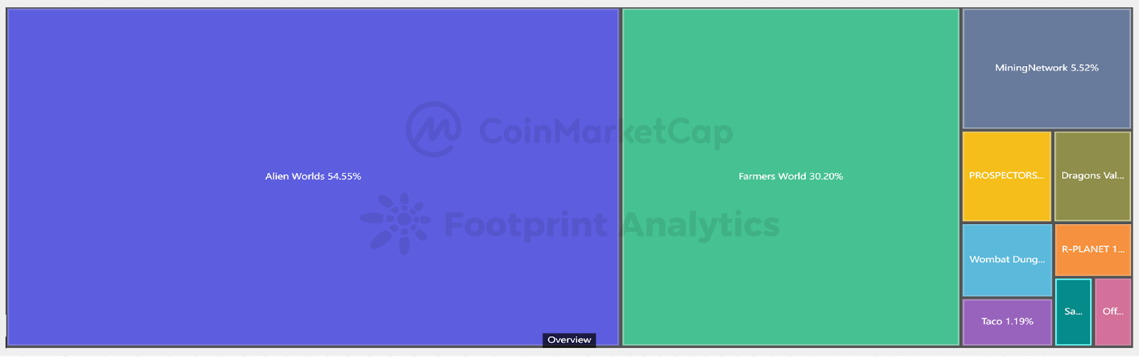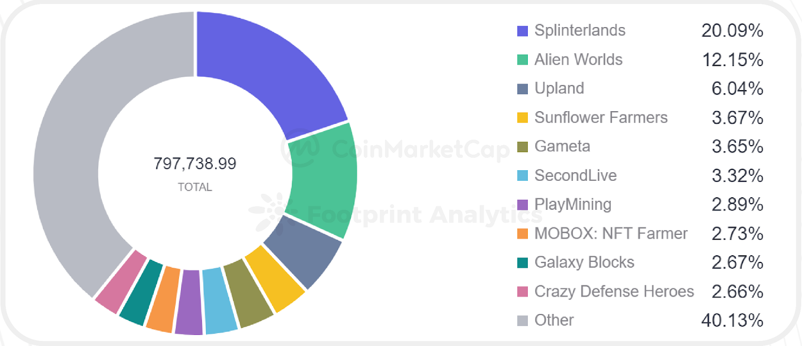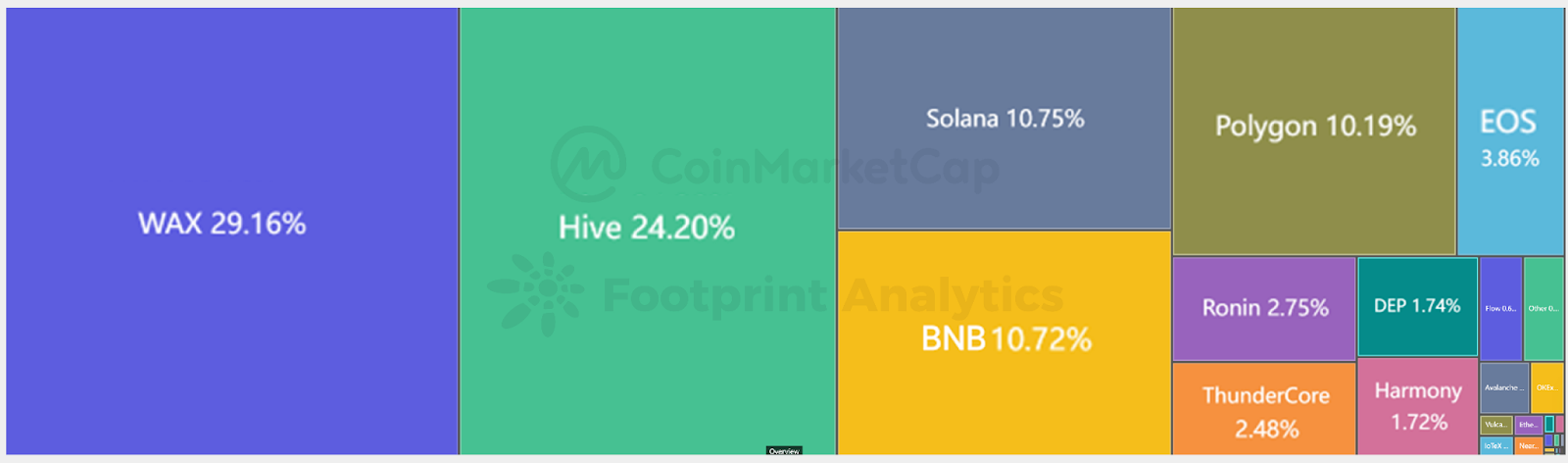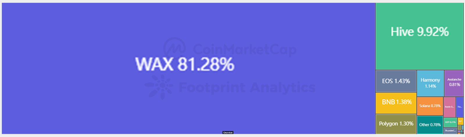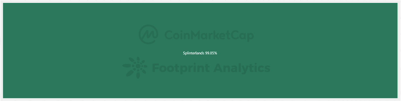 WAX 和 Hive 是交易量排名前两名的 GameFi 公链,极大程度上依赖于 Alien Worlds 和 Splinterlands 的成功,两个游戏的用户数量分别占其链上游戏玩家总数的 54.55% 和 99.85%。值得一提的是,这两条公链都不是为了单个游戏专门设立的(Ronin 就是专为 Axie Infinity 创立的公链)。
