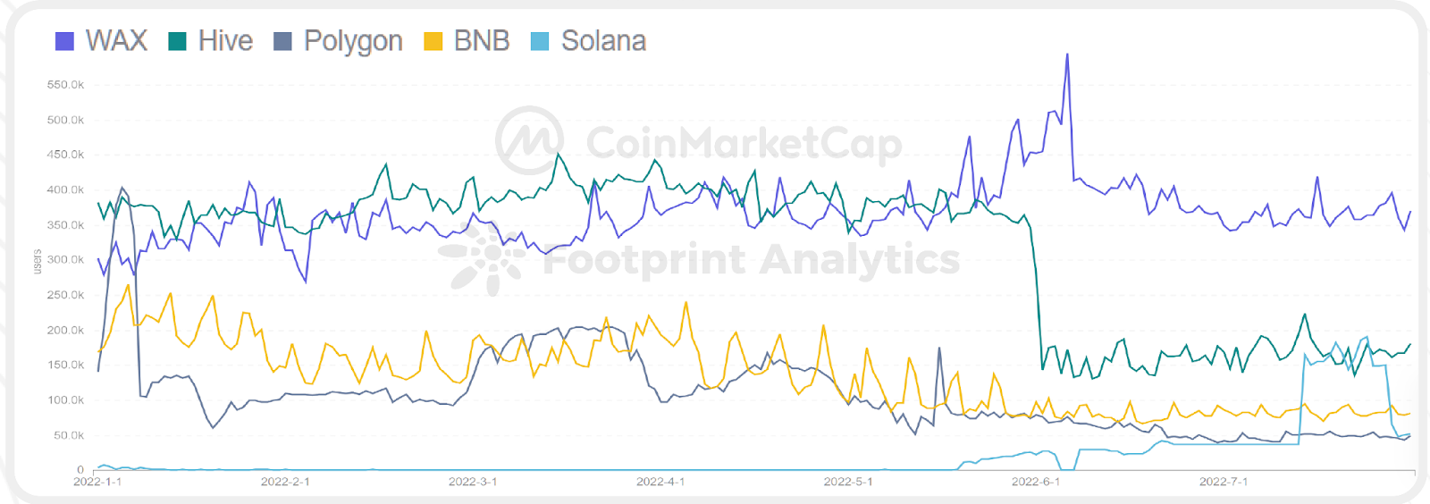 从 2022 年上半年的交易量和平均用户数两个指标来看,主打 GameFi 的 WAX 链和 Hive 链包揽公链中的前两名。