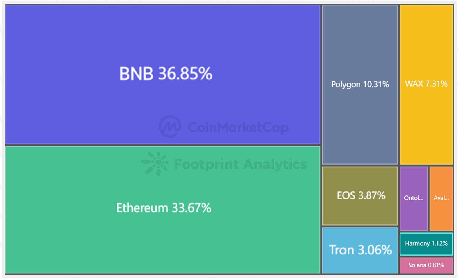 按游戏交易量和用户数计算,BNB 链是 GameFi 领域的第三大链,目前没有任何一个项目在其生态系统中占主导地位。一旦有一个主导项目出现,BNB 链将潜力无穷。