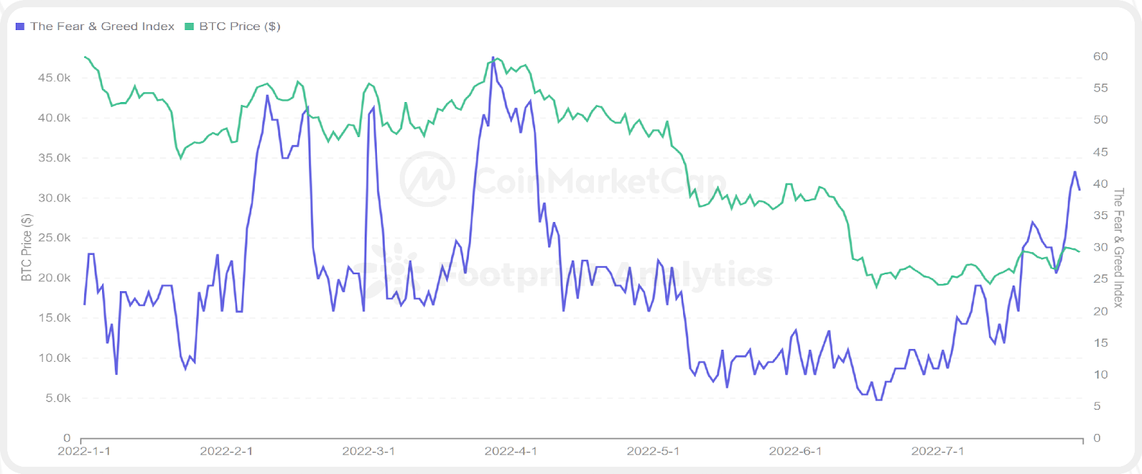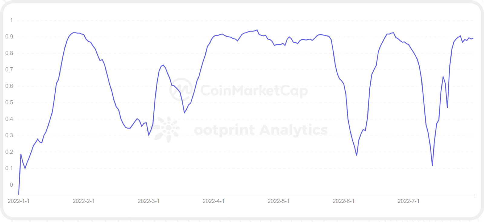 市场的恐惧与贪婪指数(Fear & Greed Index)也达到了极度恐惧的程度,GameFi 项目的活跃用户数(一定时间内与项目合约交互的唯一地址数)也逐渐下降。尽管该指数已经由 6 月底的 10(极度恐惧)恢复到现在的 42(恐惧)。然而,目前为止,加密货币的币价还未有明显回升。
