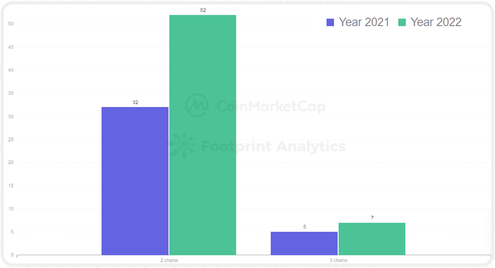 顶级游戏 DeFi Kingdoms 和 STEPN 在 2022 年 3 月都进行了第二条链的部署,意在获得更多用户、分散风险,但同时也遇到了代币经济相关的问题。SETPN 最初在 Solana 链上推出。当它扩展到 BNB 链时,BNB 链上的 GST(功能型代币)的币价增长到了 Solana 上 GST 的 9 倍,主要是因为缺乏跨链桥和需求大幅偏向于 BNB 链。虽然这两条链上的 GST 的价格差距在加密货币市值缩水后急剧减少,但以太坊上最新部署 STEPN 之后,各链上的 GST 又显示出价格差距,这也是创建多链生态系统的挑战之一。