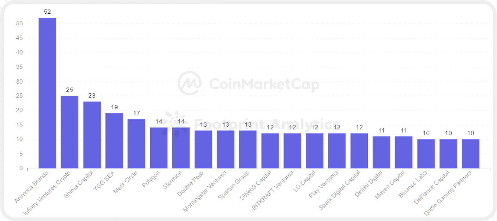 从融资金额来看,Epic Games 在 2022 年 4 月获得了索尼集团和 KIRKBI 的 20 亿美元投资投资金额占据市场首位。在项目数量方面,Animoca Brands 以一年内投资的 52 个项目的数字领先,涵盖 GameFi、Metaverse、公会等领域。