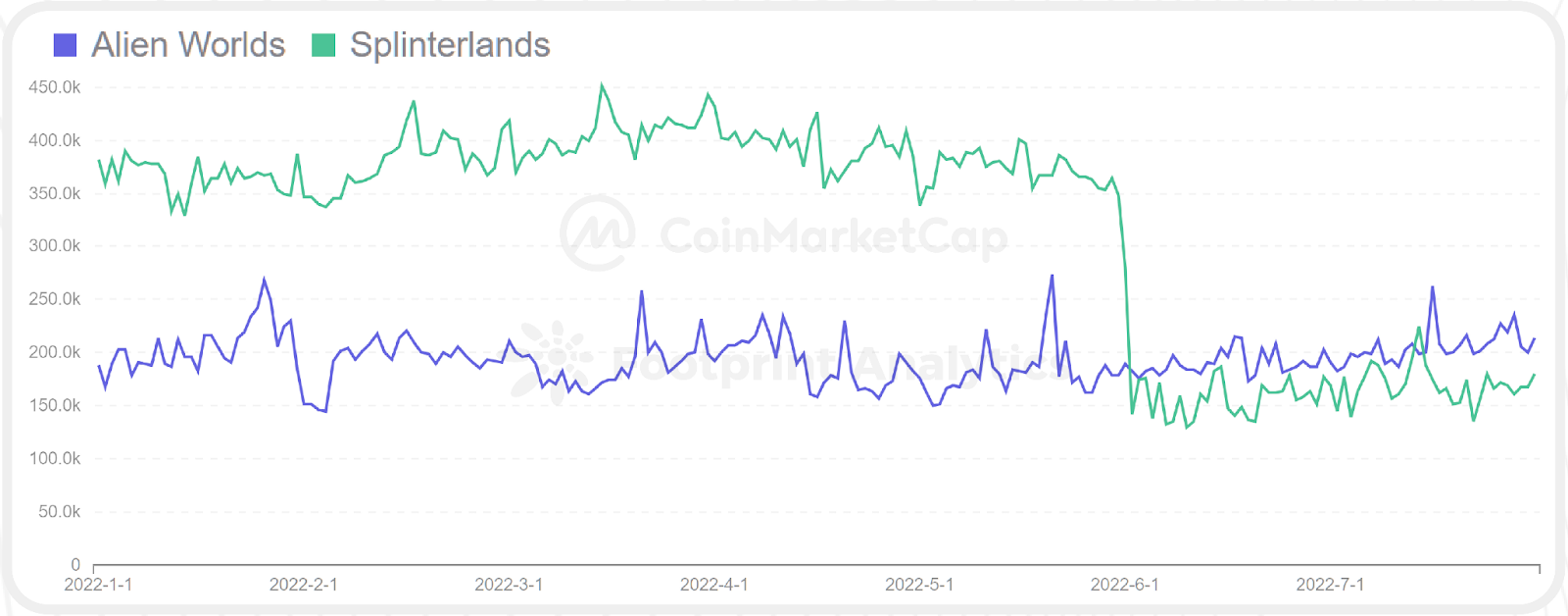 另一方面,Alien Worlds 和 Splinterlands 占据了主要地位,而这两款游戏在 GameFi 领域名气并不大。在币价下跌、投资回报率(ROI)较低的情况下,它们依然留住了用户。虽然 Splinterlands 在 2022 年上半年以几乎两倍的活跃用户领先于 AlienWorlds,但 6 月之后,其活跃用户数急剧下降。 可能原因包括 6 月 1 日当季赛季的结束、排名奖励系统的修改、加密市场的下行压力,或者,是所有因素的结合。Alien Worlds 和 Splinterlands 虽然不是市场上仅有的有趣游戏,但他们避免了市场起伏周期中资产的恶性通货膨胀。