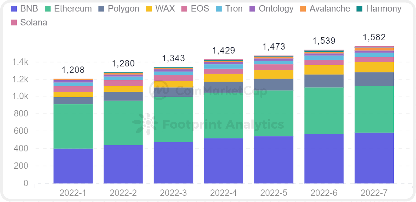 BNB 链和以太坊仍然是游戏生态系统最丰富的链,分别拥有超过 582 和 538 个项目。