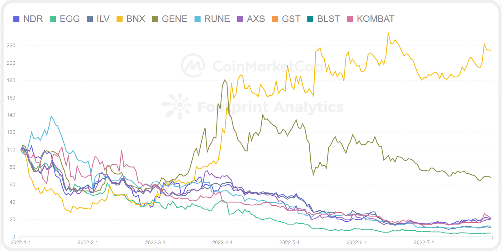 图 22:币价前十名的 GameFi 代币趋势(按币价排名,以 100% 为基准)