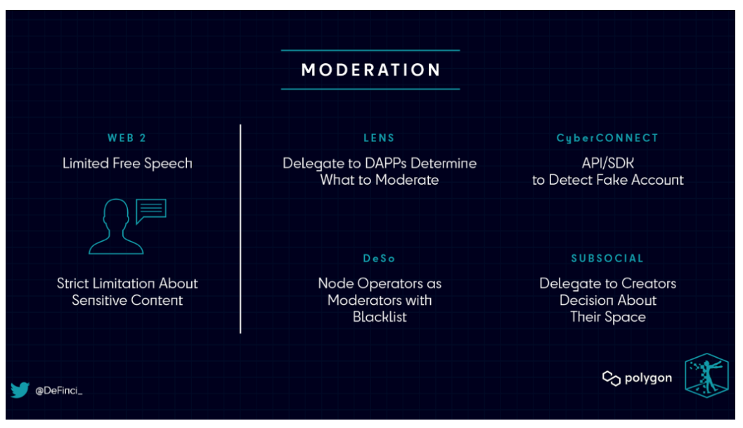 在讨论审核和审查制度时,这种拥有自己的关系网的想法变得更加重要。唐纳德·特朗普被禁止使用推特,然后去做了他自己的社交媒体应用:Truth Social。随着这一转变,他失去了现有的粉丝。对于那些不属于政治人物的个人来说,情况仍然要糟糕得多,他们有可能因为社交媒体禁令而失去生计。彼此竞争的各个DeSoc应用正在尝试各种审核技术,以保持在法律范围内,同时也避免web2审核的过度。