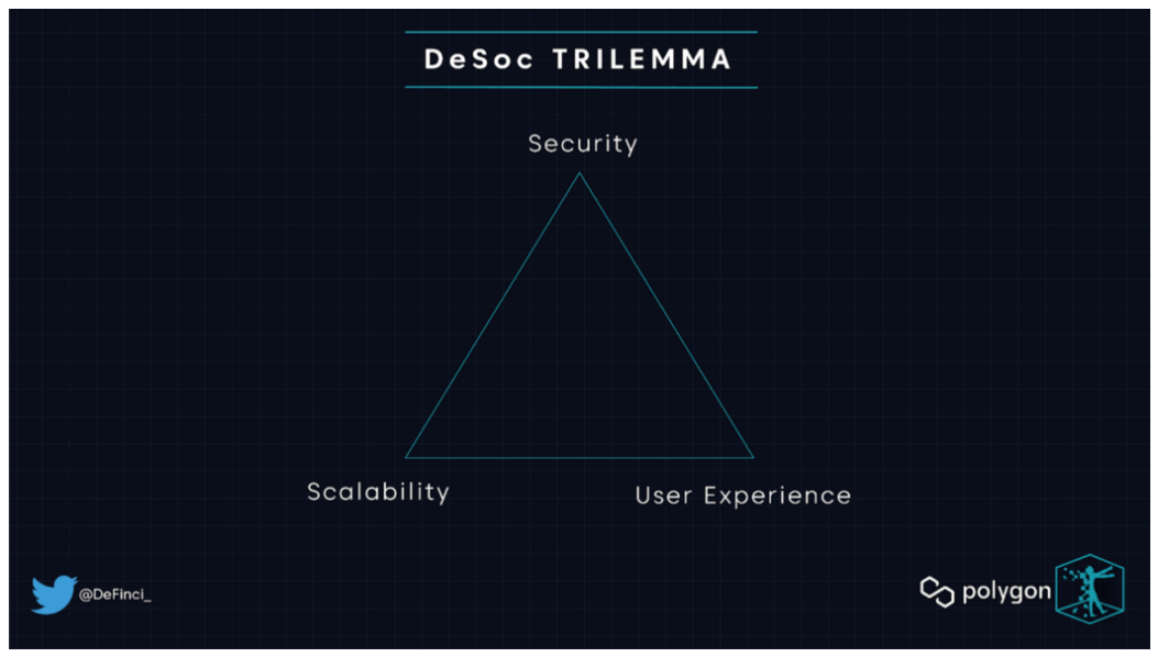 虽然看起来DeSoc是web2社交媒体所有问题的答案,但没有完美的解决方案。是的,DeSoc解决了上面提到的问题,但它引入了自己的一套复杂性。我们创造了“DeSoc三难困境”这个次,以强调在设计DeSoc协议时在安全性、可扩展性和用户体验(UX)方面所做的权衡。在Vitalik的“区块链三难困境”的基础上稍作改变,我们审查过的协议没有一个能够成功地优化所有这三个特征。