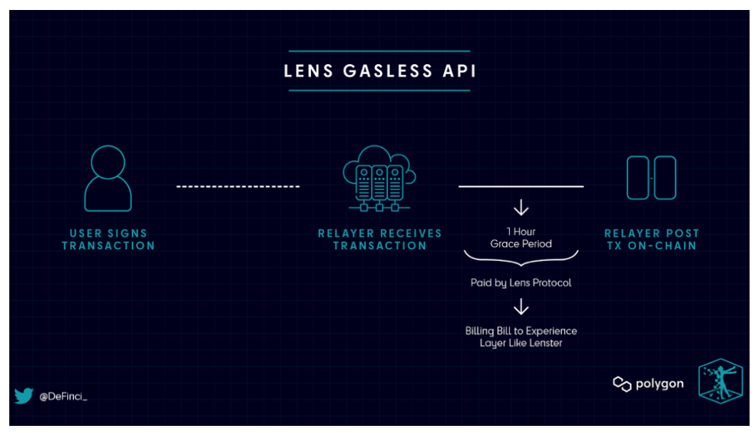 该API允许用户简单地签署一条消息(例如,作为一条评论),然后中继者接收这条消息与相关的信息,将数据上链,完成交易。对于中继者来说,这种方法稍微有点耗gas费,因为他们必须验证签名,然后在链上发布数据。然而,它让用户体验更有趣和满意。应用层平台需要支付gas费,这意味着Lenster或LensFrens有义务支付这些费用。虽然使用无gas费API的缺点是,用户依赖中继者在链上发布交易,而不是自己完成交易,但考虑到社交媒体发布不需要与金融交易相同的安全级别,这种权衡是值得的。此外,中继器也增加了灵活性,有一个小时的宽限期,可以在链上正式发布交易,他们可以避免高gas费用的时期。