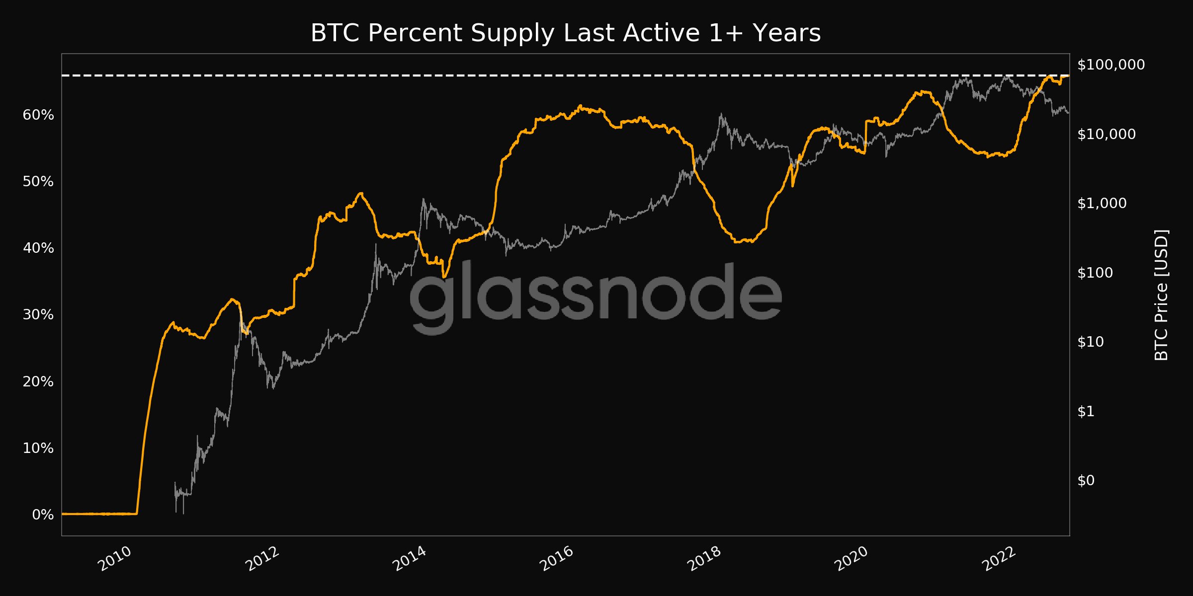 休眠1年或以上时间的比特币供应百分比图表 来源:Glassnode/推特