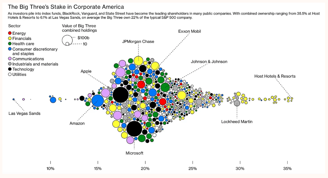 例如,贝莱德一直在推进其ESG议程,因为该公司是大多数标准普尔500指数的前五大股东,赋予贝莱德重大的投票权。听起来熟悉吗?