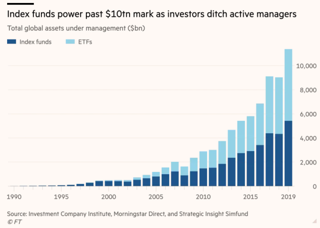 过去几十年来,指数化,或在一套特定的规则内投资于"一篮子资产",一直是第一投资趋势。到2020年,指数基金的总资产管理规模(AUM)达到10万亿美元。三大指数基金:贝莱德(BlackRock)、Vanguard和道富银行(State Street)总共管理着22万亿美元的资产管理规模。三大指数提供商标准普尔道琼斯指数、富时罗素指数(FTSE Russell)、摩根士丹利资本国际(MSCI)促成了以其指数为基准的总计超过40万亿美元的资产管理规模。