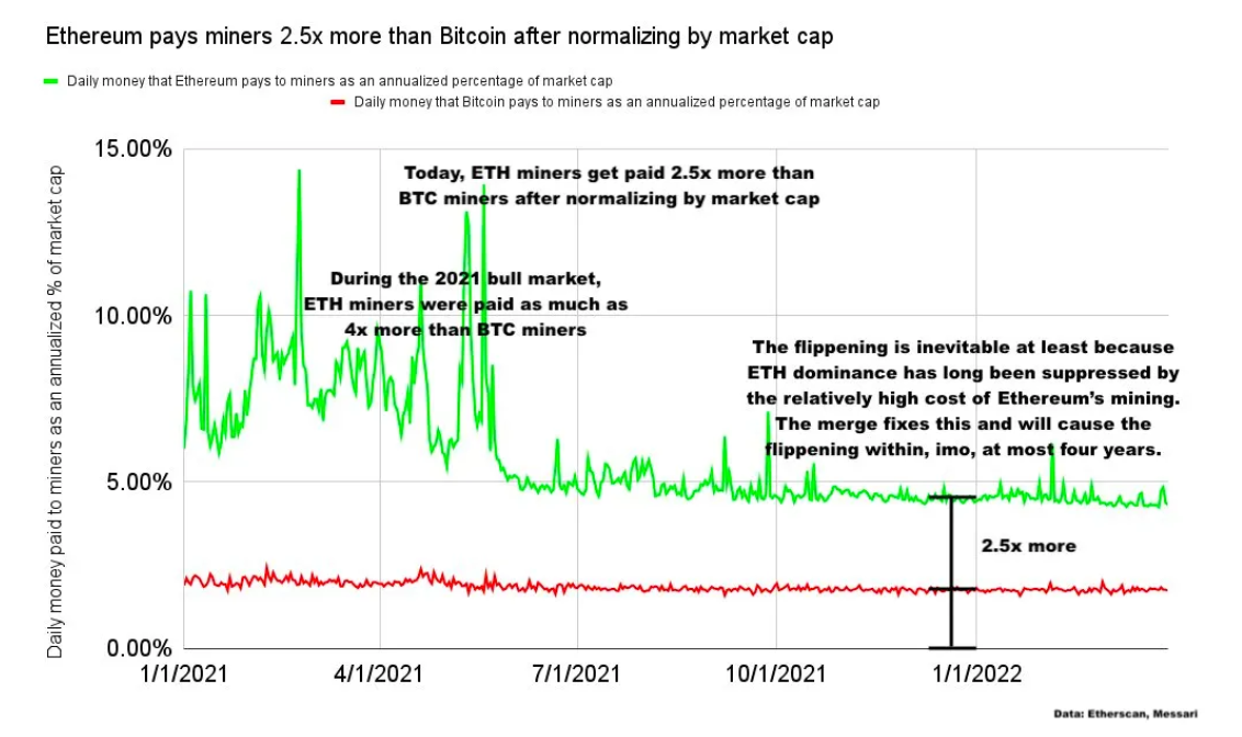 ETH矿工的报酬历来比比特币矿工高得多。如果两条链的成本结构互换,例如,如果BTC矿工的收入与ETH矿工的收入相同,反之亦然,或者如果合并在两年前就准备好了,我认为翻转可能早已发生了。