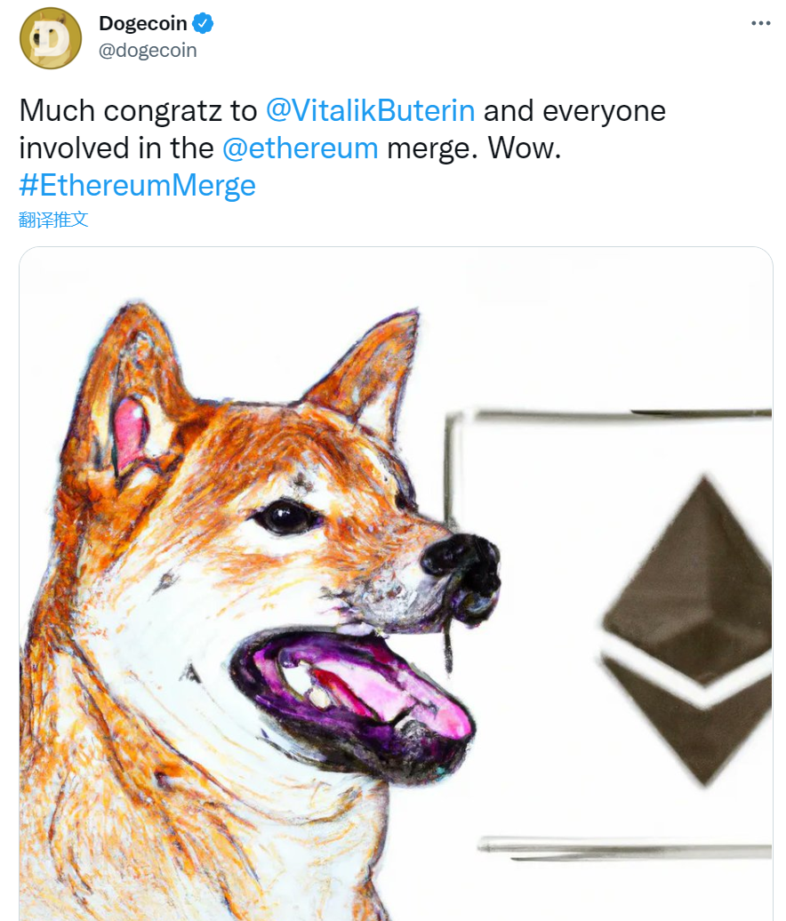就连现在市值第二大的PoW加密货币狗狗币(Dogecoin)背后的推特账户也向以太坊联合创始人Vitalik Buterin和所有参与合并的人表示“热烈祝贺”。