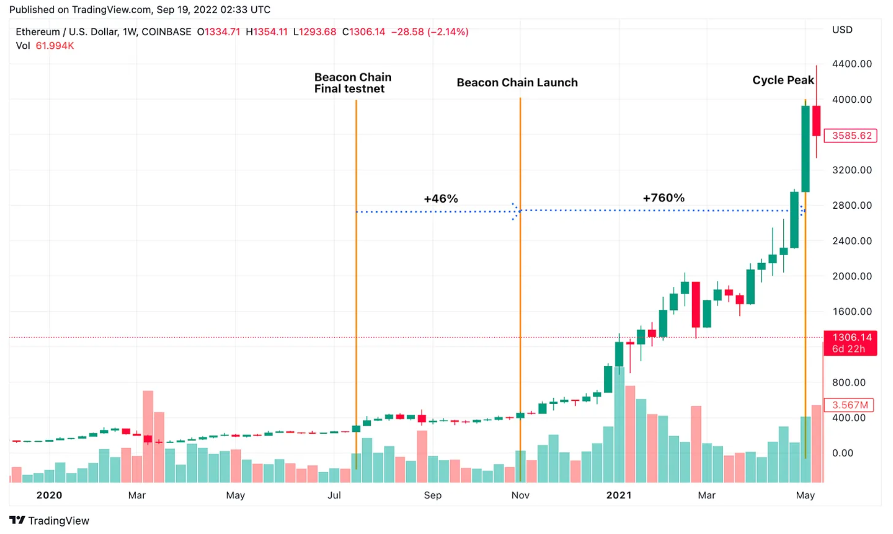 在Sepolia上的第二次合并彩排之后,ETH从6月初的800美元底部大幅反弹,随着主网合并日期的确定,ETH在8月份几乎达到了2000美元。