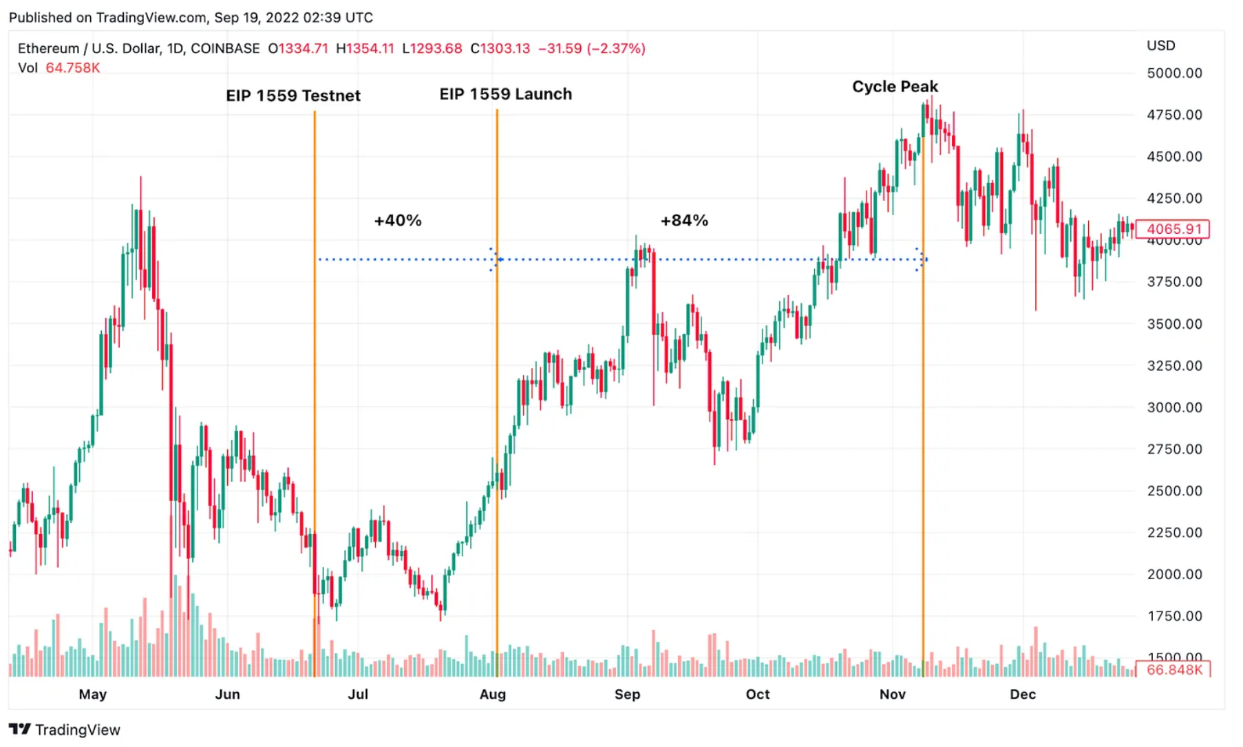 EIP-1559于2021年8月实施,当时ETH的价格从5月的前一次历史新高大幅下跌。