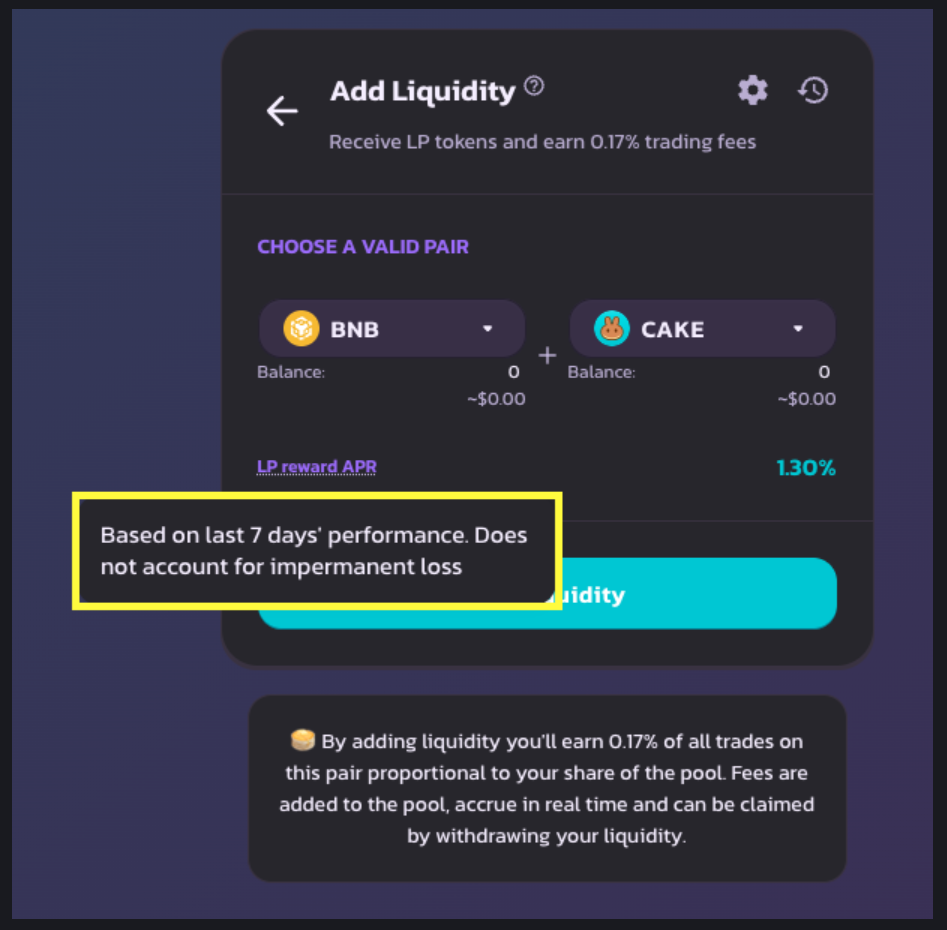 Pancakeswap对流动性提供者发出无常损失警告