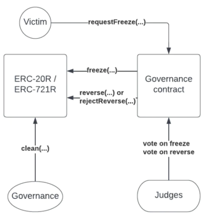 2、法官接受或拒绝冻结请求。去中心化的法官群体投票决定是否冻结资产。审议时间最多也就一两天。如果他们拒绝了请求,程序就会停止,受害者就会失去他们的资金。如果他们接受请求,那么治理合约将冻结ERC-20R/ERC-721R合约。