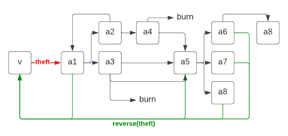 假设攻击者从受害者那里窃取了资金。资金可能被进一步转移到其他地址,如下面的图1所示。会发生以下情况: