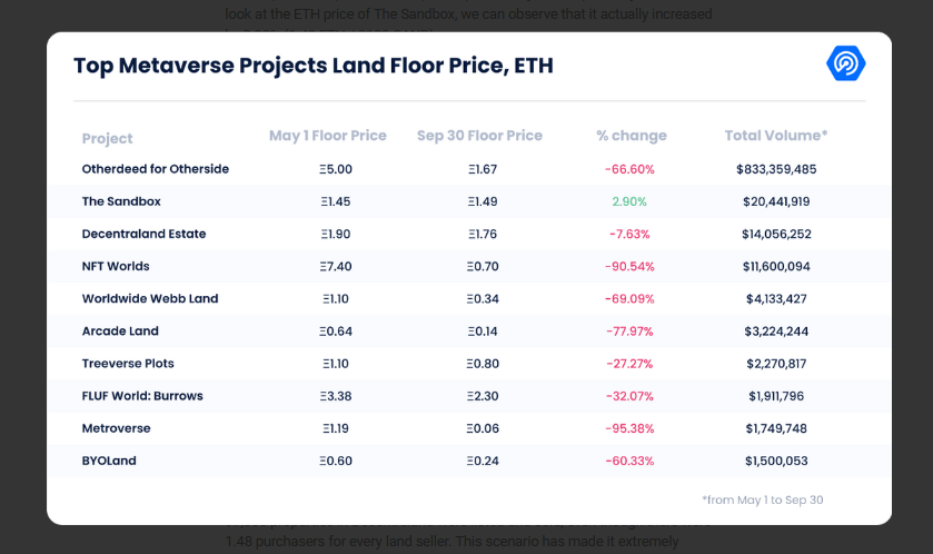 然而,对这些情绪的警告是,在第三季度,排名前10的元宇宙项目中,有8个项目的NFT销售额大幅下降,Yuga Labs的Otherside销售额在本季度下降了74%。