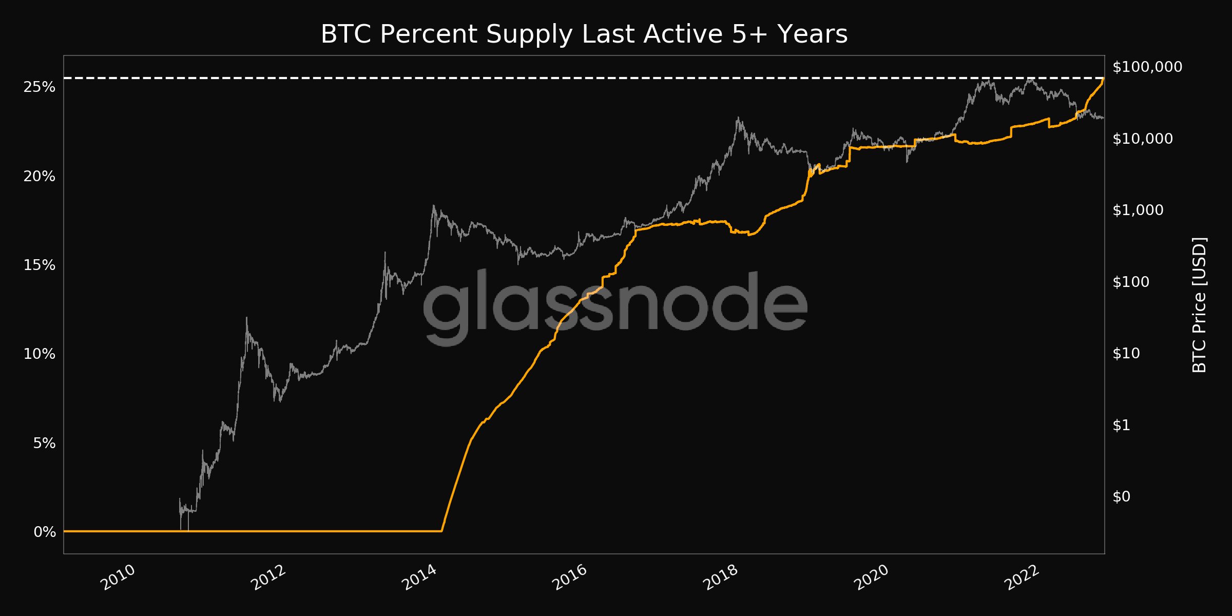 供应问题正变得越来越有预见性——Glassnode还证实,目前休眠至少5年的BTC供应比以往任何时候都要高,达到25.47%。