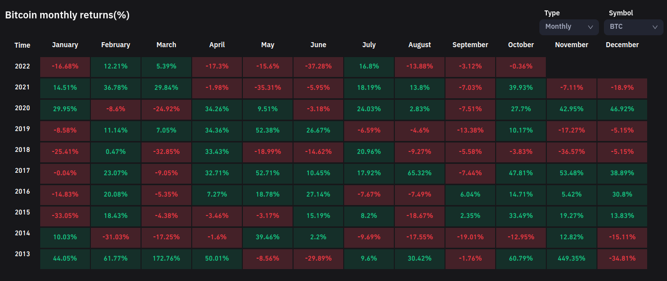 数据资源Coinglass的数据显示,从百分比上看,2022年10月是有记录以来最平坦的10月,相比之下,去年上涨了40%。