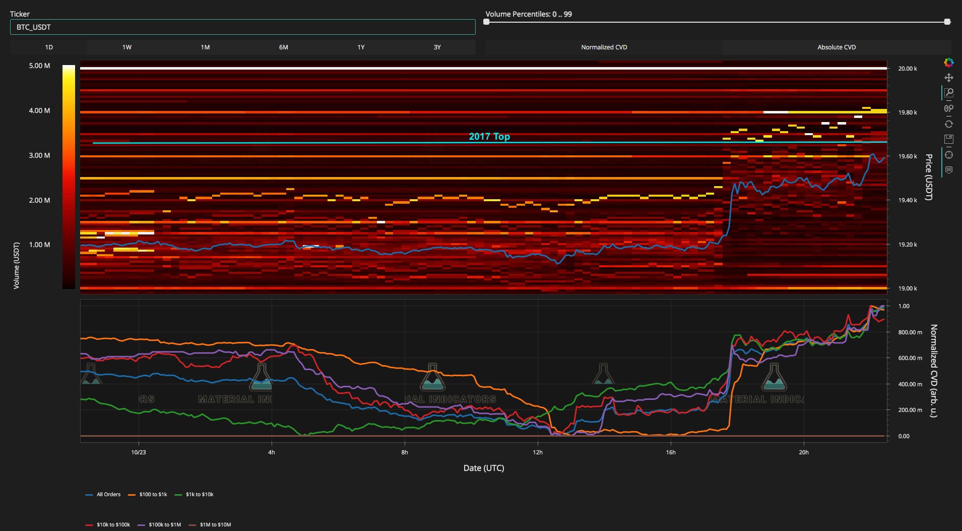 追踪订单簿流动性变化的Material Indicators进一步指出,对应于比特币2017年旧的历史高点的阻力位已经软化。