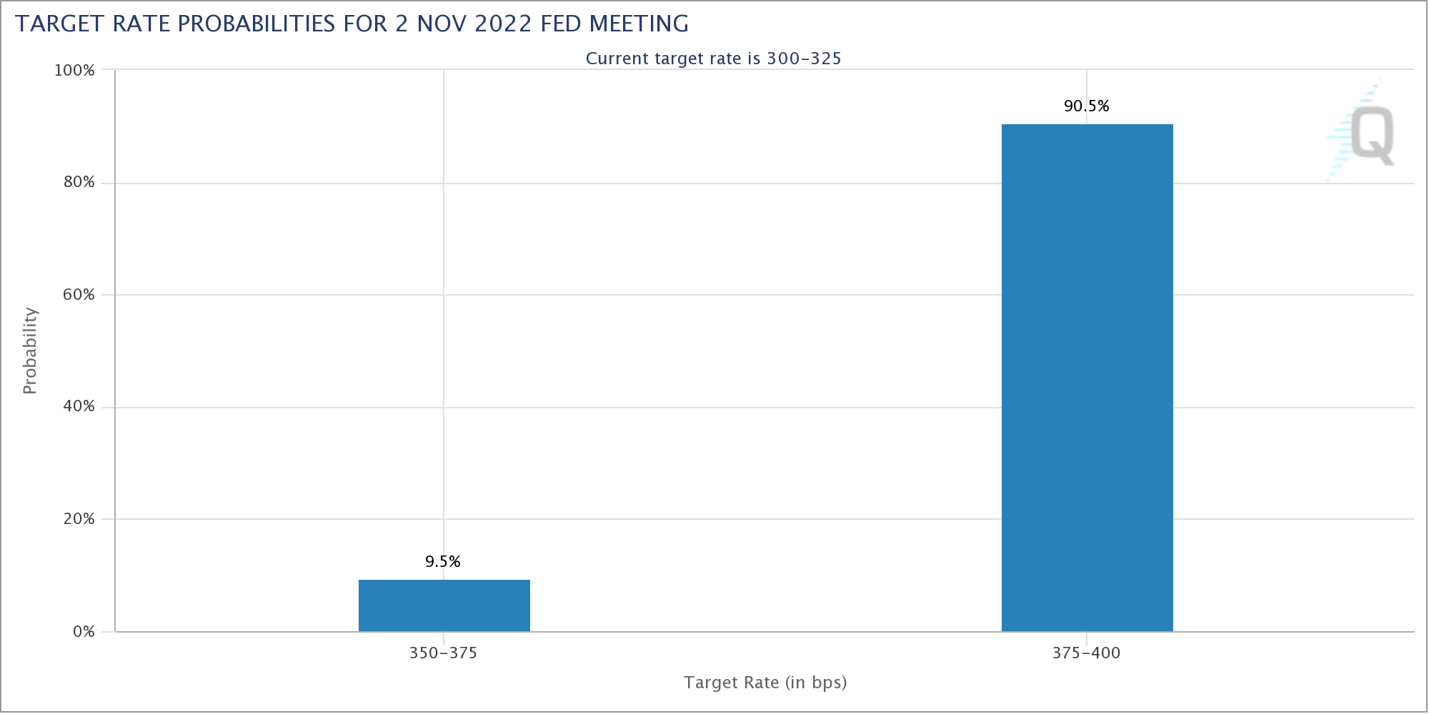 截至撰写本文时,芝加哥商品交易所(CME Group)的FedWatch Tool显示11月份加息75个基点的可能性为90.5%。
