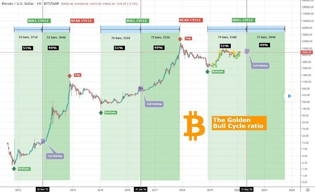 “比特币熊市平均持续12.5个月。这被称为黄金牛市周期比率,”满怀希望的开发者James Bull在周末评论道。