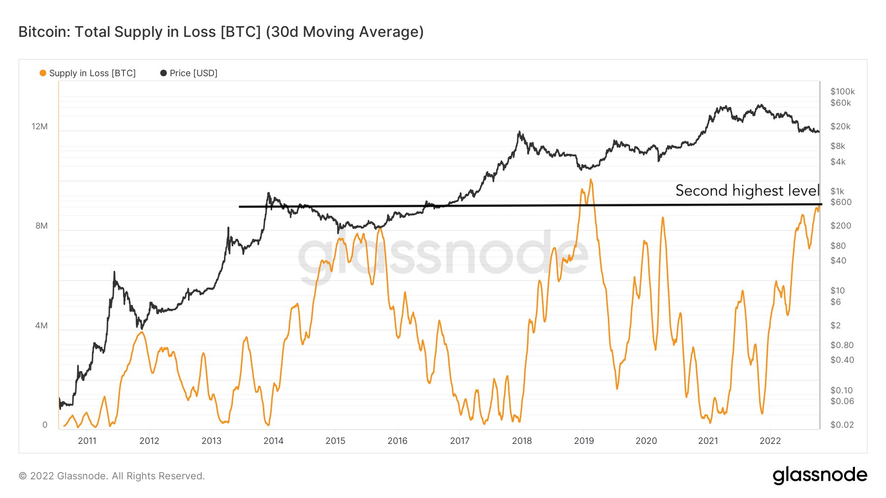 不包括丢失或长期持有的比特币,亏损持有的比特币30天移动平均数量目前几乎处于历史高点。
