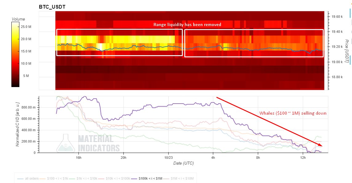 他总结道:“该区间内的流动性已被移除,或至少大幅减少。”他补充道,“鲸鱼(持有10万至100万美元比特币的用户)正在减持。”