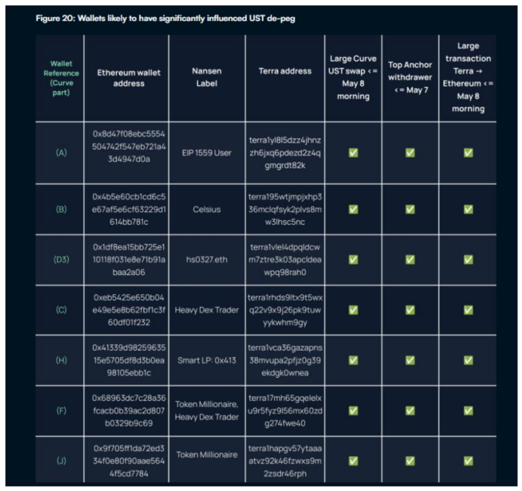 Nansen在分析UST的脱钩过程中,列出了七个对脱有重大影响的钱包。其中一个钱包被确认属于Celsius,他从Anchor Protocol提款造成的损害大于益处。这一点将在下一节进一步讨论。